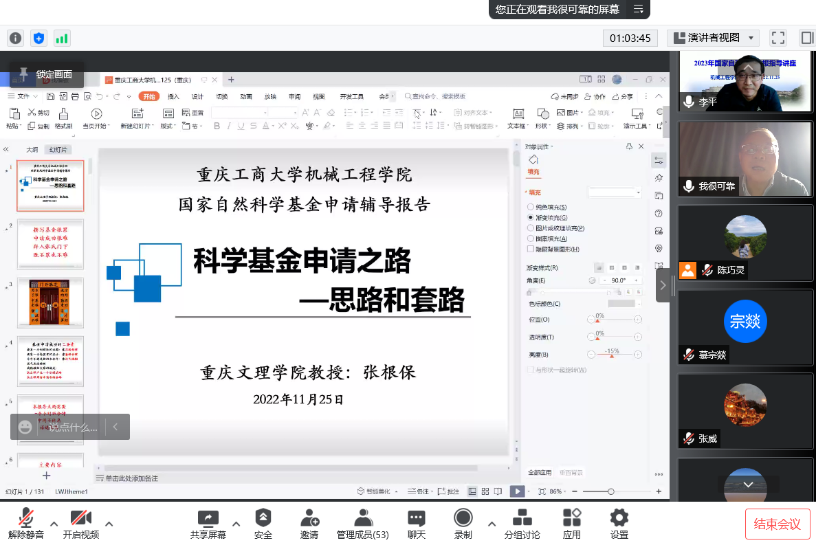 为做好2023年度国家自然科学基金项目申报工作,进一步提升项目申报质量,11月25日下午,公司邀请重庆大学张根保教授作了题为“科学基金申请之路——思路与套路”的线上专题培训。讲座由太阳集团tyc33455cc经理杜力主持,副经理李平和太阳集团tyc33455cc30余名教师参加。