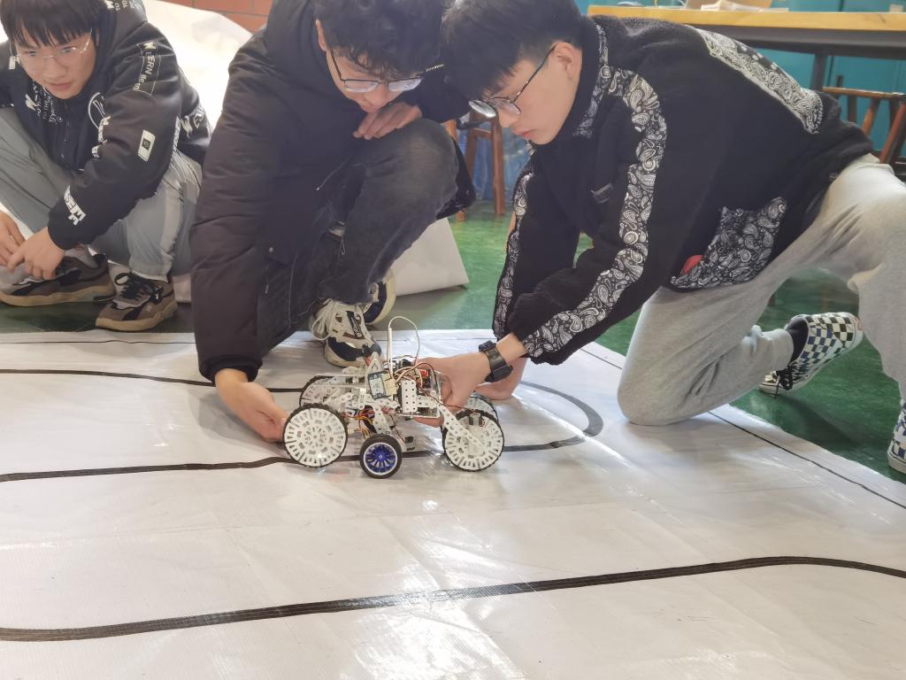 作为科技活动月众多比赛中的一部重头戏,全地形小车的比赛实况十分有看头。何远航组一马当先,该组制作的小车车体轻盈,快速精准地通过障碍,扎破气球到达终点;汤涌组的两对大车轮格外醒目,顺利通过前两个障碍后,由于车头较重,在攀爬第三个障碍物时略显吃力,但整体完成度较高;周成燚组的小车机械设计感十足,与前两个组明显不同的是,该组以小车轮为主,只在车体最前面安置了一对大车轮,小车顺利通过了两个障碍物,由于设计上的不足,行进到第三个障碍物时受阻而未能抵达终点;刘海林组的小车车轮及底盘较宽大,车身较小,车体构造简洁,因此行动稳健;李晓峰组的小车与上一组相比综合性能不相上下,但由于设计上的缺陷并未走完全程。