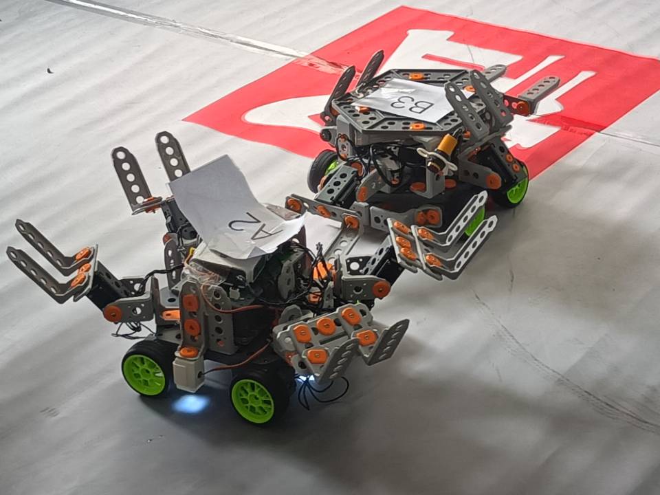 赛前,六组选手按照比赛前的抽签分组预先进行了组内循环赛,以积分制的形式角逐出选手排名。选手们将自己的机器放入比赛场地内,两组机器人在场地内进行着激烈的竞技。赛场上气氛焦灼,每一次竞技的胜利,都会带来选手们脸上难以掩盖的喜悦,每一次的失败也能带来不甘和遗憾,这也正是竞技比赛的魅力和意义所在!每组队员们辛勤付出,都享受着比赛的过程。有的小组队员激情澎湃,为自己在台上“战斗”的小车加油助威;有的小组队员面色凝重,正为自己机器人的突发状况而冥思苦想;还有的小组队员喜笑颜开,为自己的机器人获得的成绩感到发自内心的满足与高兴。