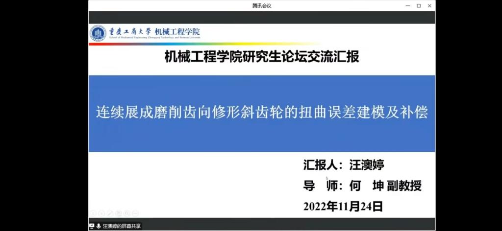 2022年11月24日,太阳集团tyc33455cc分团委在线上开展了科技创新文化活动月讲座—“机械研究生论坛”。此次讲座上,多位太阳集团tyc33455cc在读研究生进行演讲,从场协同干切滚刀研究、激光熔覆进展研究、多道激光熔覆搭接率建模方法、连续展成磨削齿向修形斜齿轮的扭曲误差建模及补偿、激光熔覆模拟技术等研究方向展开了介绍,进一步开阔了本科同学们的眼界,让其感受到了科学研究的魅力。