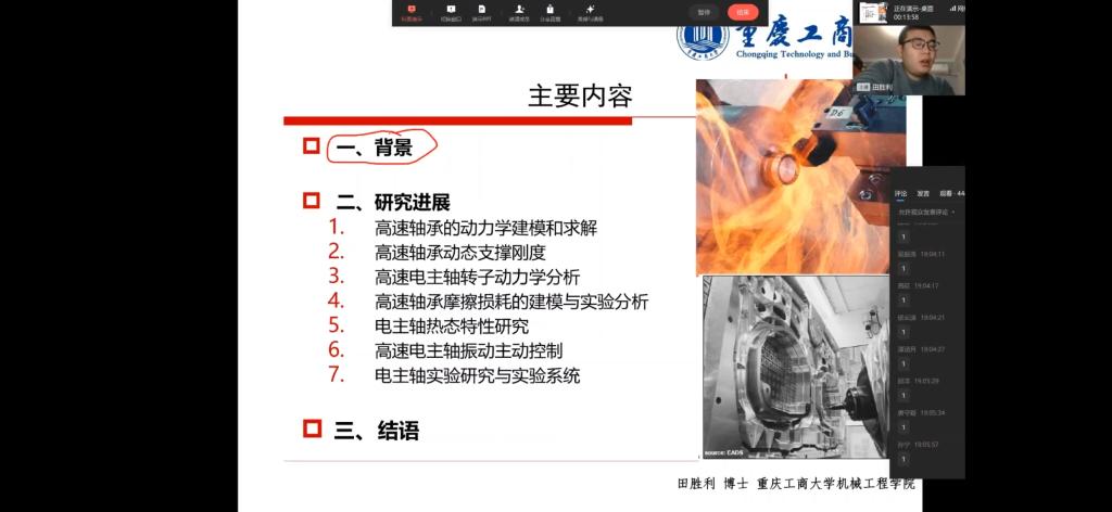 2022年11月15日,田胜利老师在线上开展了科技创新文化活动月“博士开讲啦”系列学术讲座——“电主轴核心关键技术主题讲座”。田老师从两个角度讲解此次讲座内容,分别是电主轴核心关键技术背景及相关研究进展。对于背景重点从高速电主轴整体设计、精密制造与装配技术等方向进行了讲解。对于研究进展则从高速轴承动力学建模与求解、轴承动态支承刚度分析几个方面进行了讲解。田老师总结,高速电主轴是典型的复杂机电系统,同学们需要关注了解相关研究成果,努力学习,勇于参加竞赛,获得更多的专业知识,不断提升自我,为祖国制造业发展而贡献。
