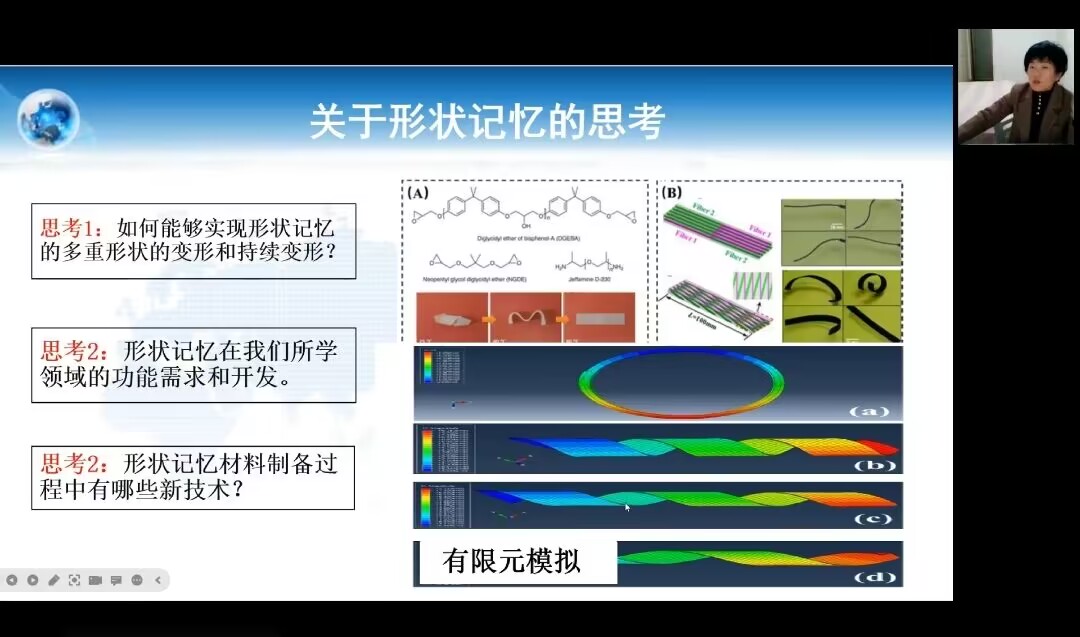2022年11月25日,黄美娜老师在线上开展了科技创新文化活动月“博士开讲啦”系列学术讲座——“有趣的形状记忆材料”。黄老师从材料的记忆、形状记忆的过程两个方面入手详细介绍了相关知识,指出在生活中包装防伪标签、服装、变色仿生等皆与此有关,同学们在日常生活中也要注意观察不同材料的特性,掌握更多的知识。通过此次讲座,同学们了解了关于记忆材料的知识。材料应用在生活各个方面,不同的会有不同的功能,但殊途同归,多样化的知识会汇聚成磅礴的大海,如在座学子般,为国家繁荣助力。