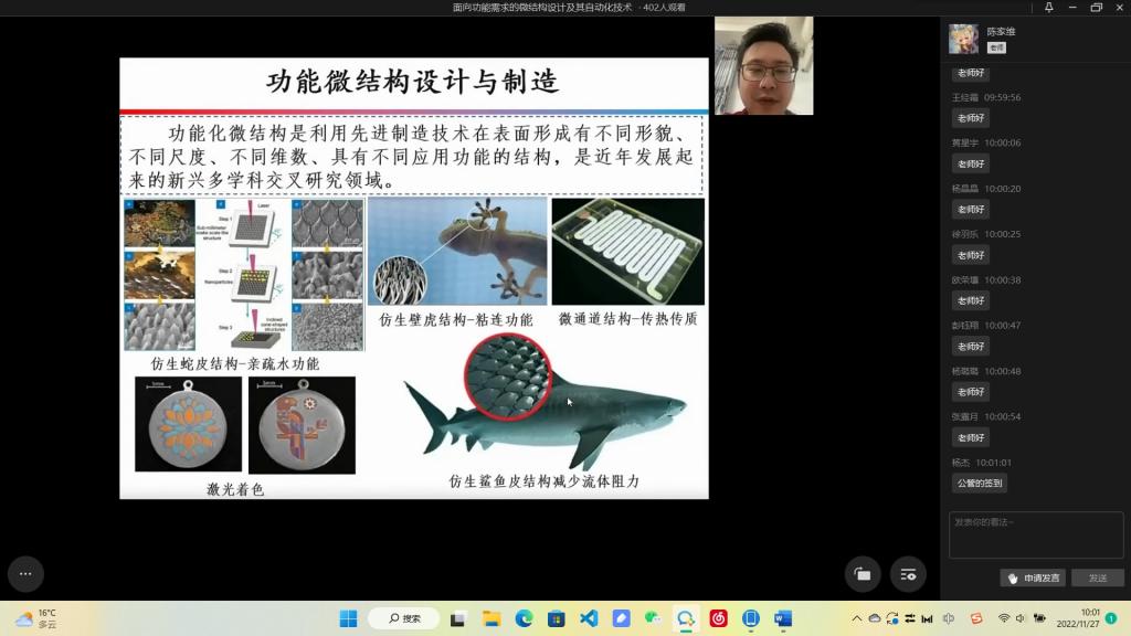 2022年11月27日,刘阳旭老师在线上开展了科技创新文化活动月“博士开讲啦”系列学术讲座—“面向功能需求的微结构设计及其制造技术”。本次讲座从功能化微结构的定义、高效制氢技术的应用、传感器的组成与功能等方面展开介绍。最后,刘老师对微结构设计及其制造技术未来进行展望,指出微结构优化和微电路优化是主要发展方向,让同学们对微结构设计及其制造技术有了初步的了解,激发了同学们对微结构的兴趣。
