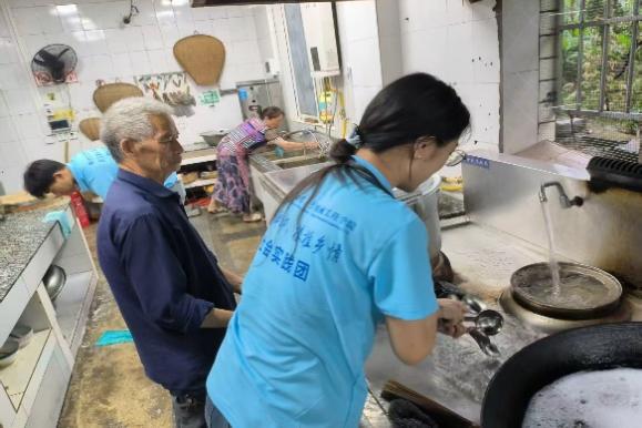 9日清晨,服务队转赴风仪村养老院开展敬老服务。到达时正值早餐时间,同学们立即投入工作,协助工作人员收拾餐具、清理食堂。