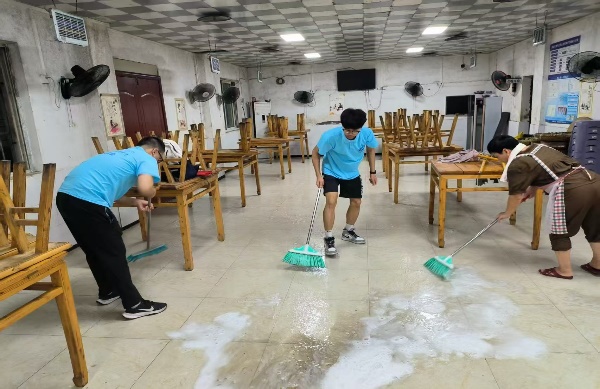 在水池边,同学戴着橡胶手套,仔细清洗着每一个碗碟。"老人家肠胃脆弱,餐具卫生要格外注意。"她一边说,一边用热水冲洗餐具。其他同学则忙着擦拭餐桌、打扫地面,确保食堂环境整洁卫生。