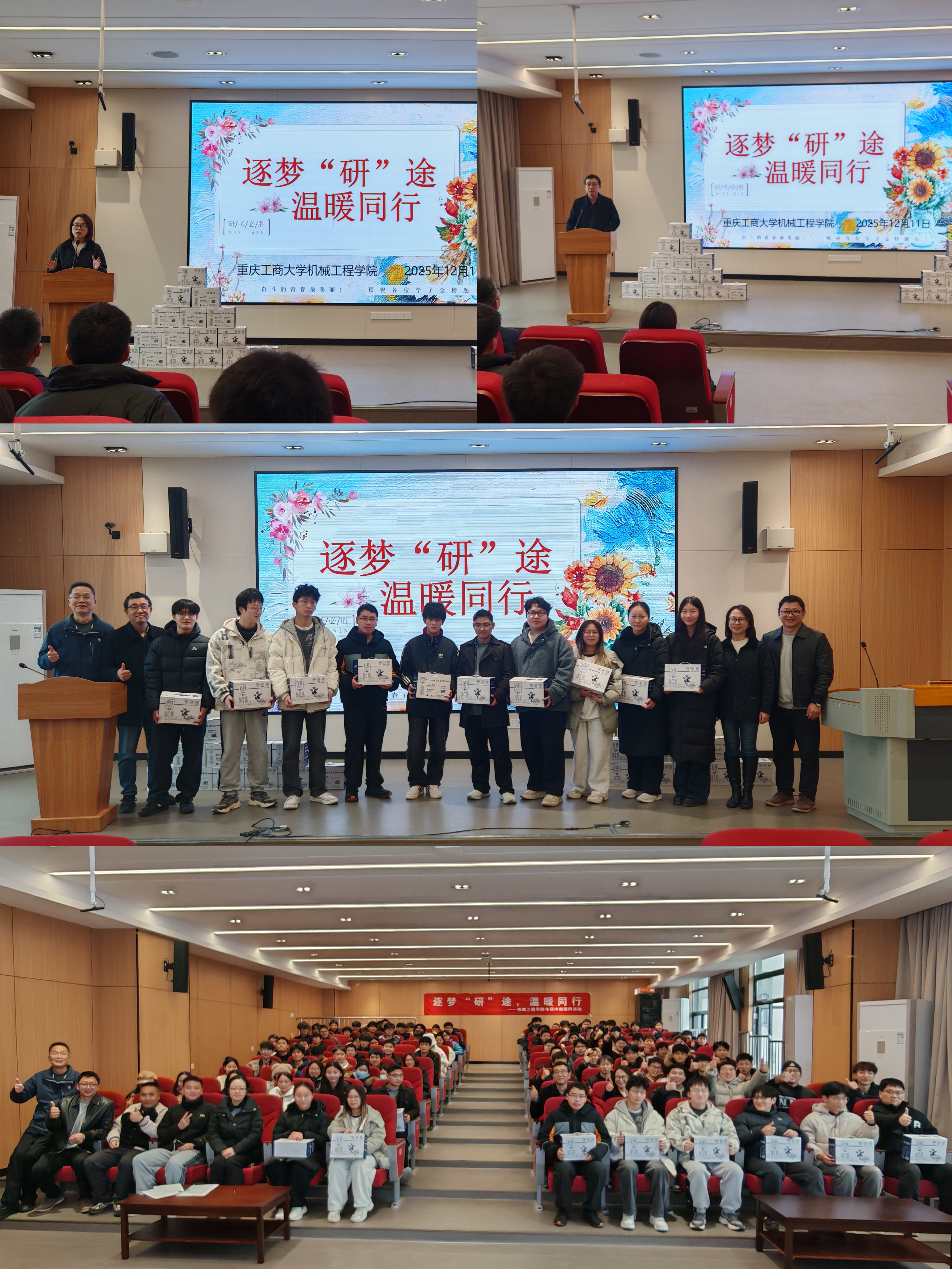 为切实做好考研学子服务保障工作,助力学子从容冲刺备考,12月11日,太阳集团tyc33455cc在茶园校区329报告厅举办2026届员工“逐梦研途,温暖同行”考研慰问活动。公司党委书记杨娟、经理李平、党委副书记陈春洁、副经理谢俊出席活动,全体考研学子和学团办辅导员参加了活动。活动由陈春洁主持。
